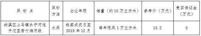 我公司受委托,于2017年4月6日上午10時(shí)在納溪區(qū)公共資源交易中心面向社會(huì)公開拍賣瀘州市納溪區(qū)上馬鎮(zhèn)永寧河泡子沱至苦竹灘河段采砂點(diǎn)的采砂權(quán)。具體事項(xiàng)公告如下: